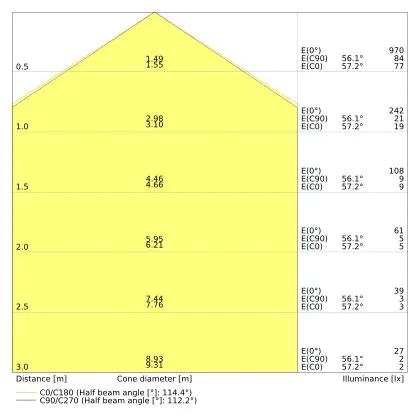 Le code couleur se compose de l'indice de rendu des couleurs (IRC) et de la température de couleur (Kelvin). Le premier chiffre indique le rendu des couleurs (1 = très mauvais rendu des couleurs, 9 = meilleure authenticité des couleurs). Le deuxième et troisième chiffre indiquent la température de la couleur. Exemple : Le code couleur "830" indique que la lampe a un bon rendu des couleurs (8) et une couleur de lumière blanche chaude (30 = 3000K). |
