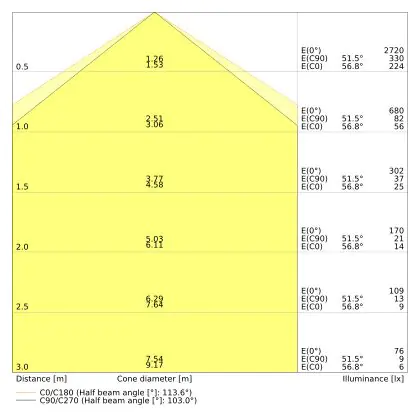 Le code couleur se compose de l'indice de rendu des couleurs (IRC) et de la température de couleur (Kelvin). Le premier chiffre indique le rendu des couleurs (1 = très mauvais rendu des couleurs, 9 = meilleure authenticité des couleurs). Le deuxième et troisième chiffre indiquent la température de la couleur. Exemple : Le code couleur "830" indique que la lampe a un bon rendu des couleurs (8) et une couleur de lumière blanche chaude (30 = 3000K). |