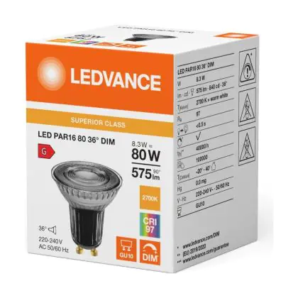 Description Ledvance LED PAR16 GU10 Réflecteur 8.3W 575lm 36D - 927 | Meilleur Rendu De Couleur - Dimmable - Remplacement 80W